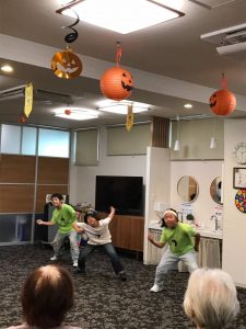 最後には、入居者の皆さんと懐かしのメロディーでリズム体操をして、子ども達はご褒美にハロウィンのお菓子を頂きました。