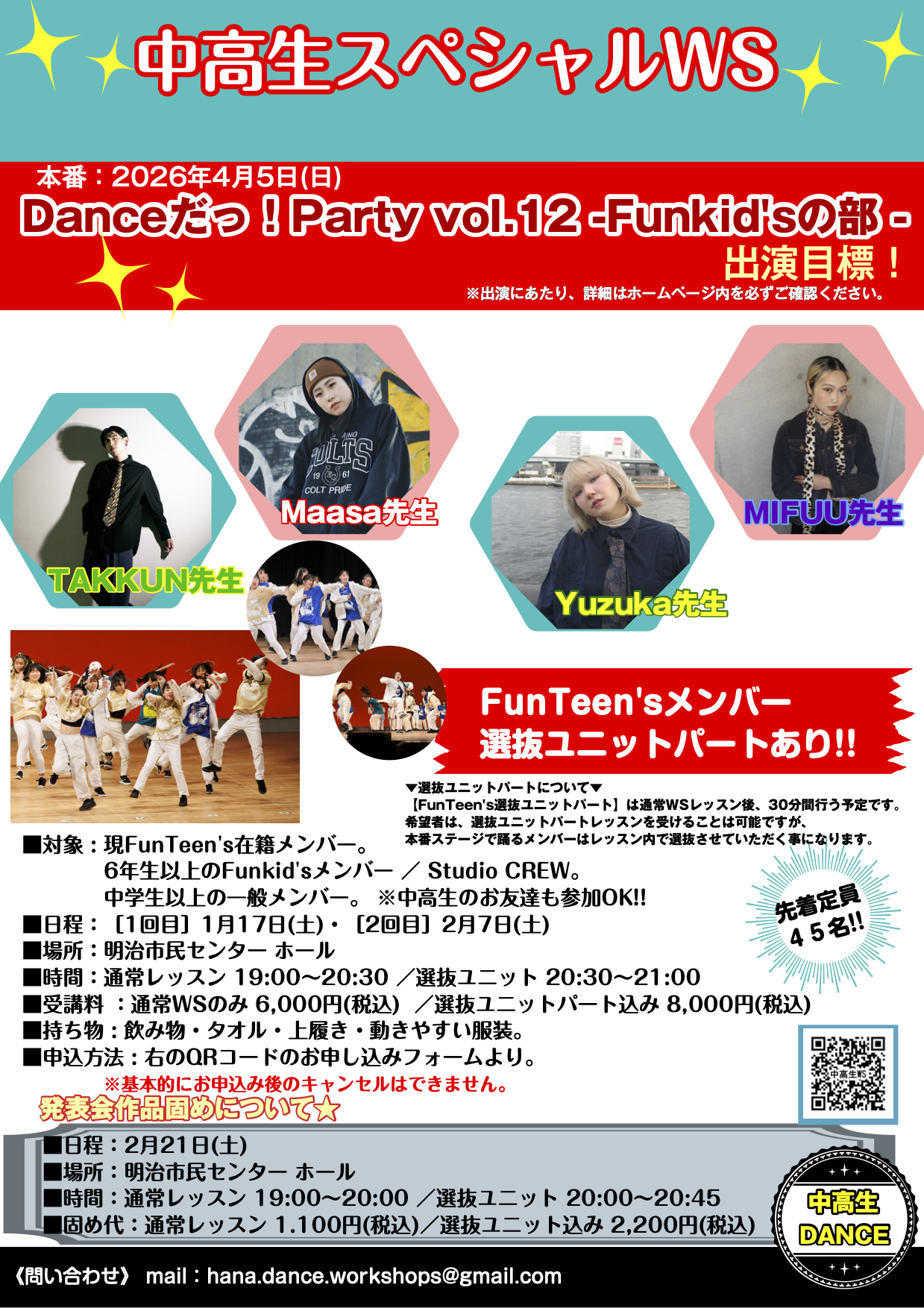 ●対象:中学1年生〜19歳(一般参加OK!!)・Funkid’s所属の小学6年生対象。