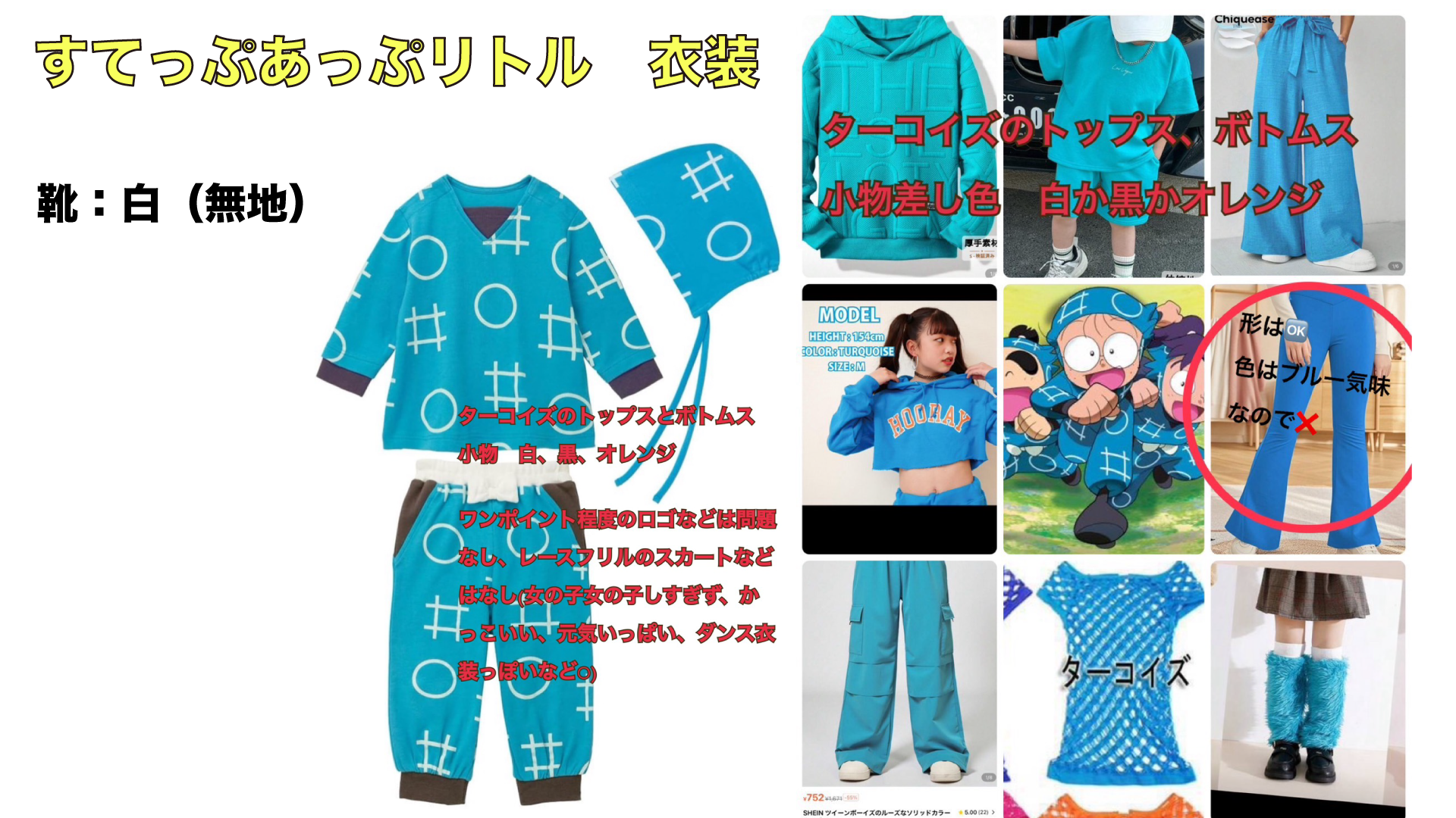 すてっぷあっぷリトル衣装 2026年1月16日 web.hana.funkids 未分類 0 すてっぷあっぷリトル衣装のご案内 ●ターコイズカラーのトップスとボトムス ●小物:白・黒・オレンジ ●靴:白 ※ワンポイント程度のロゴなどは問題なし。 ※レース・フリルのスカートNG。 ※かっこいい・元気系の衣装っぽく。 濃いめのブルーや薄いブルーはNGとさせていただきます。 下記、ご参考ください。