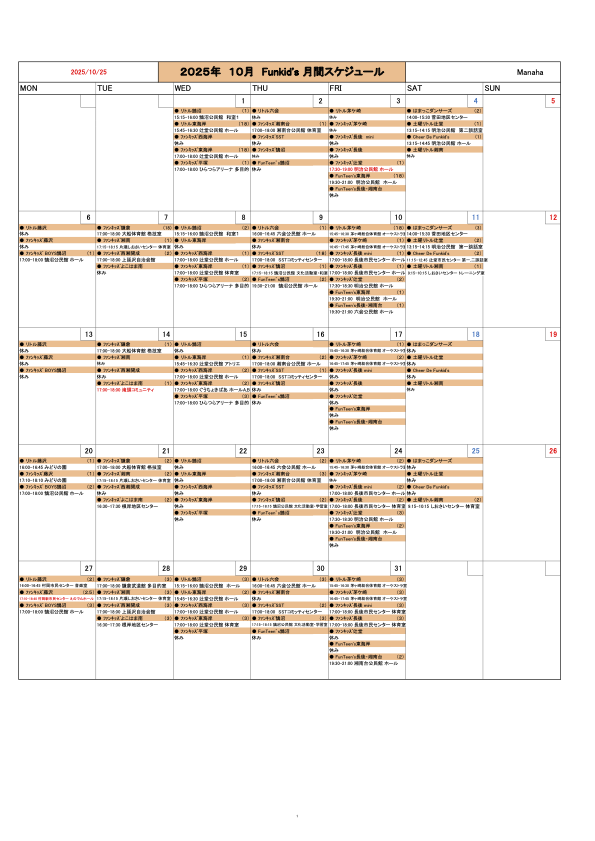 SCHEDULE ■ 2025 10月 Funkid’s 月間スケジュール 2025年10月サークル活動カレンダー ■ 2025 11月 Funkid’s 月間スケジュール 2025年11月サークル活動カレンダー