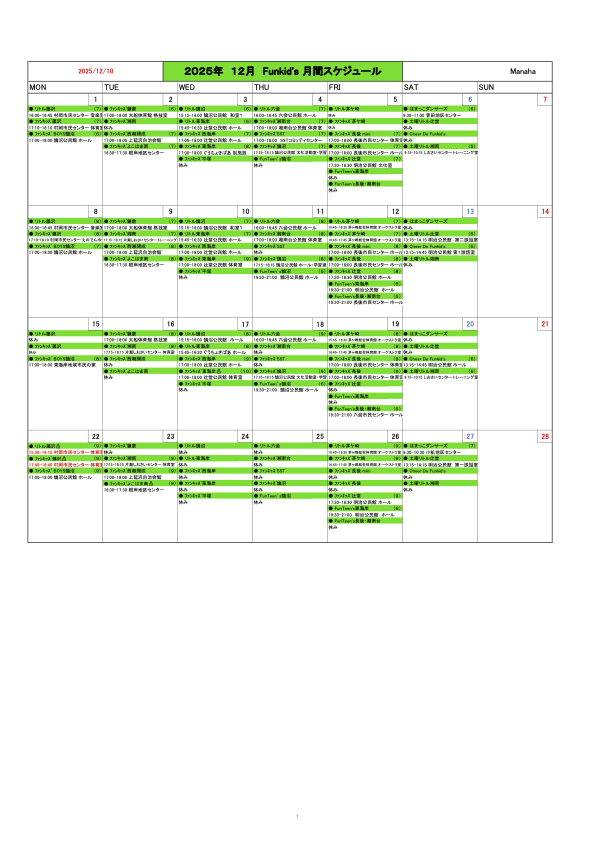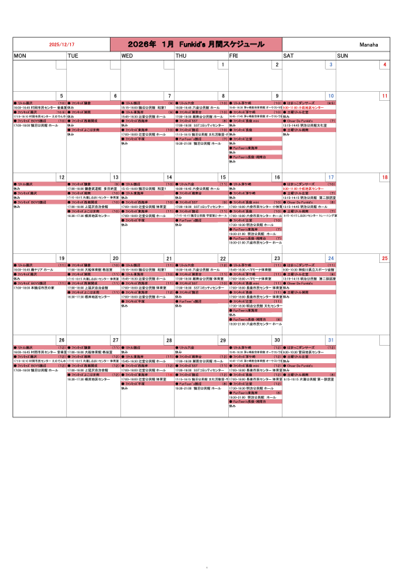 SCHEDULE ■ 2025 12月 Funkid’s 月間スケジュール 2025年12月サークル活動カレンダー ■ 2026 1月 Funkid’s 月間スケジュール 2026年1月サークル活動カレンダー