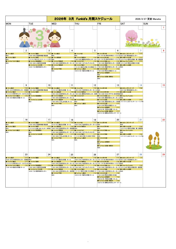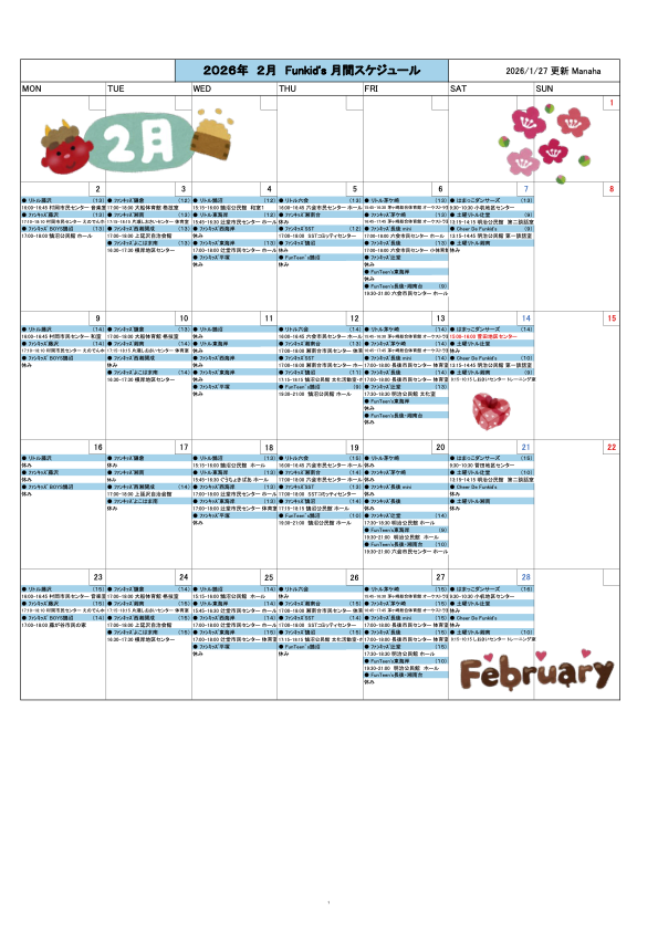 SCHEDULE ■ 2026 2月 Funkid’s 月間スケジュール 2026年2月サークル活動カレンダー ■ 2026 3月 Funkid’s 月間スケジュール 2026年3月サークル活動カレンダー