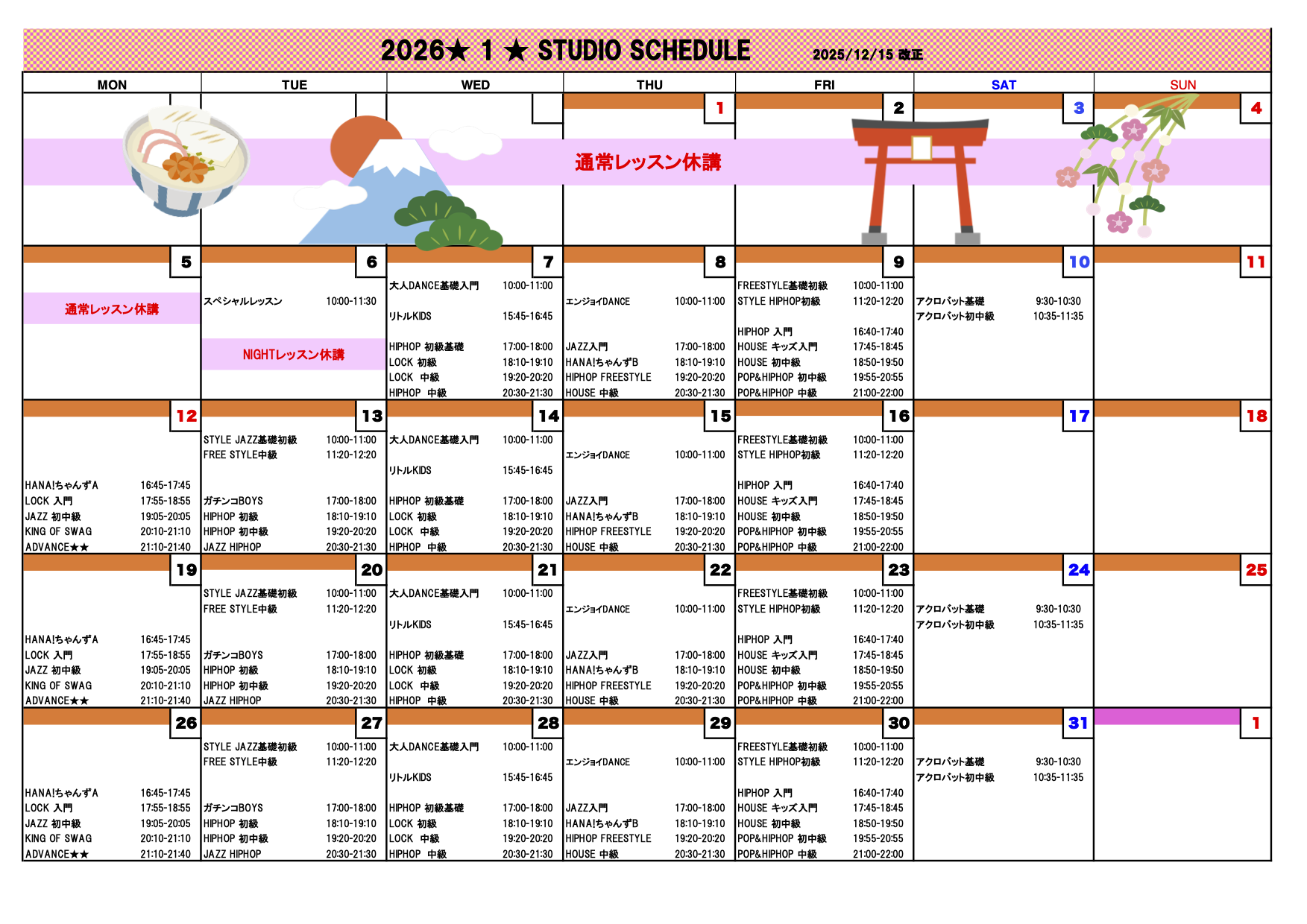 SCHEDULE WEEKLY SCHEDULE 2025年10月〜 各レッスンの内容はコチラ MONTHLY SCHEDULE 2025年12月(2025/11/20更新) 2026年1月(2025/12/16更新)