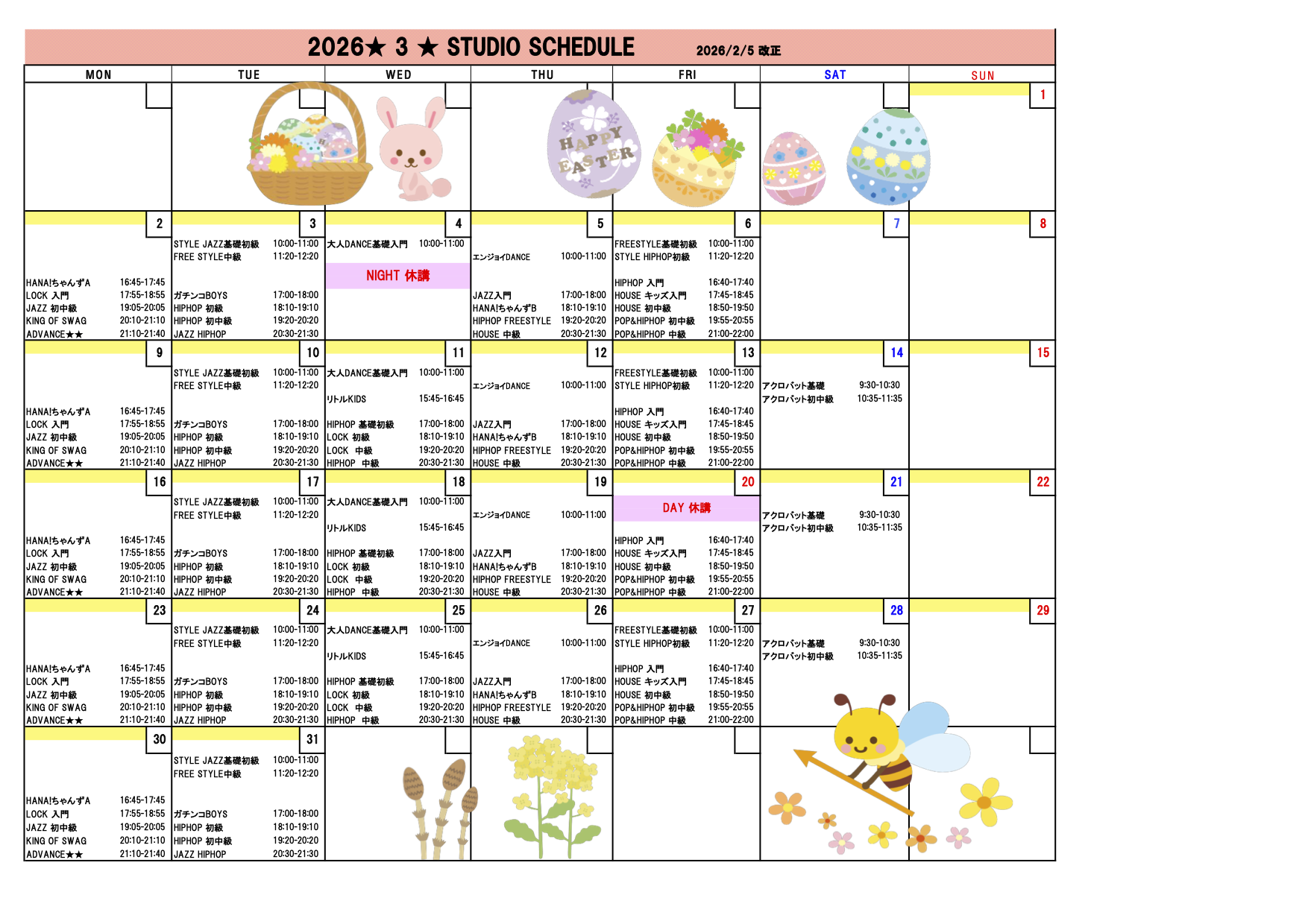 SCHEDULE WEEKLY SCHEDULE 2025年10月〜 各レッスンの内容はコチラ MONTHLY SCHEDULE 2026年2月(2026/1/25更新) 2026年3月(2026/2/12更新)