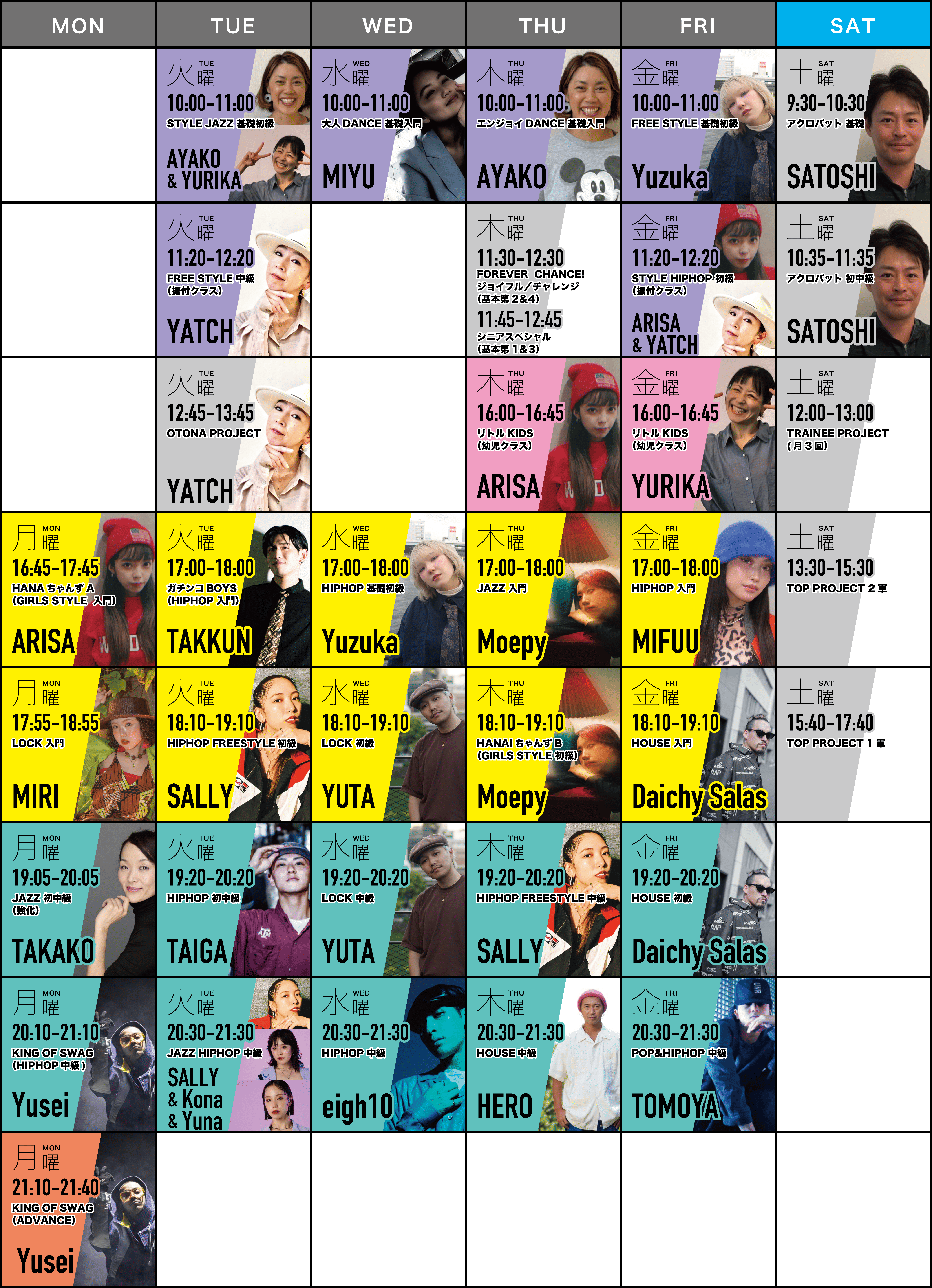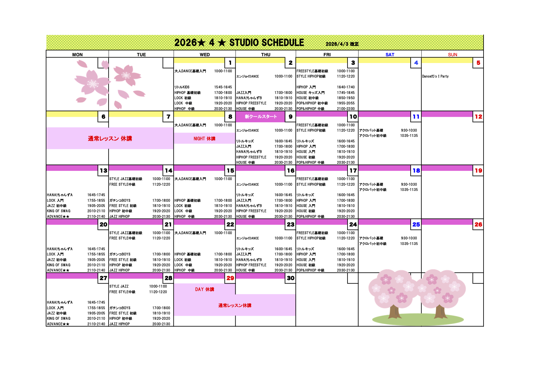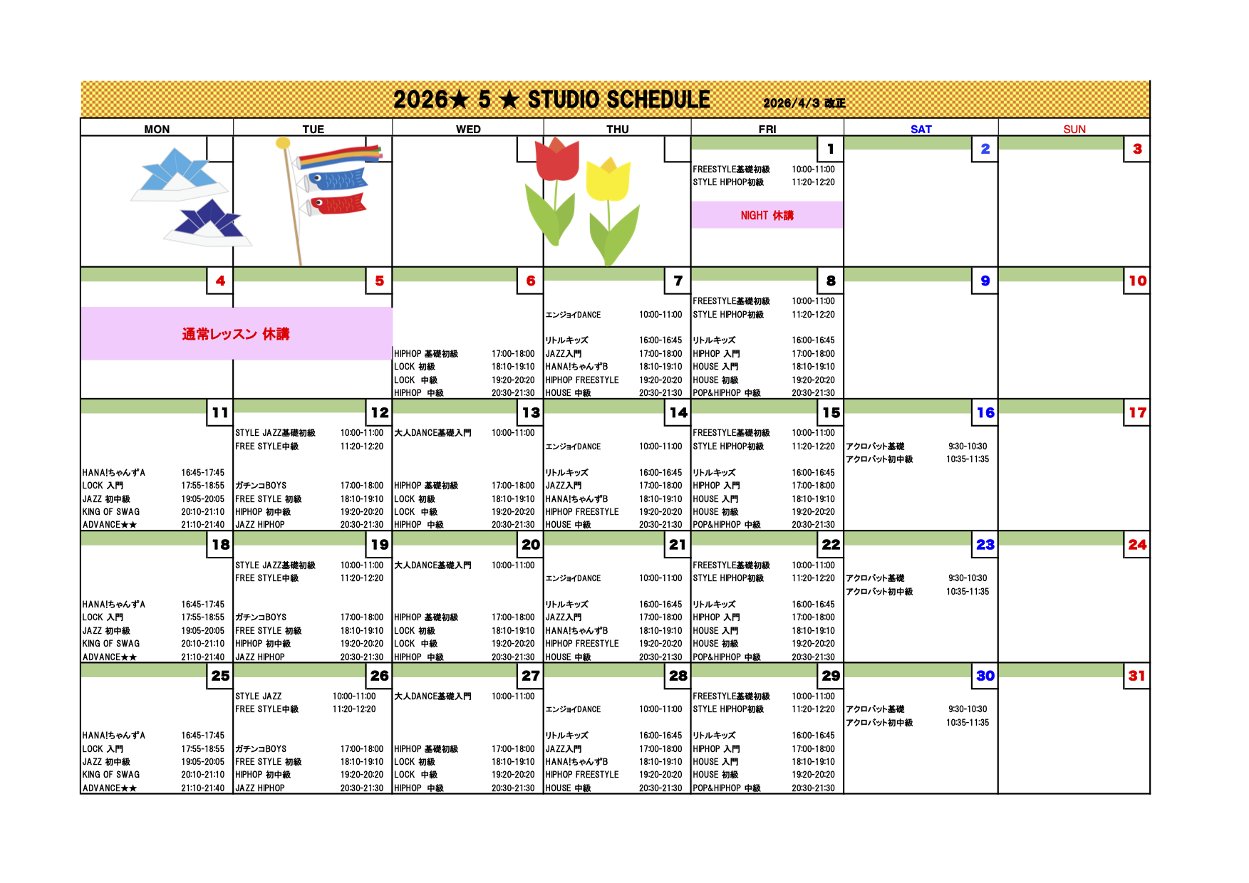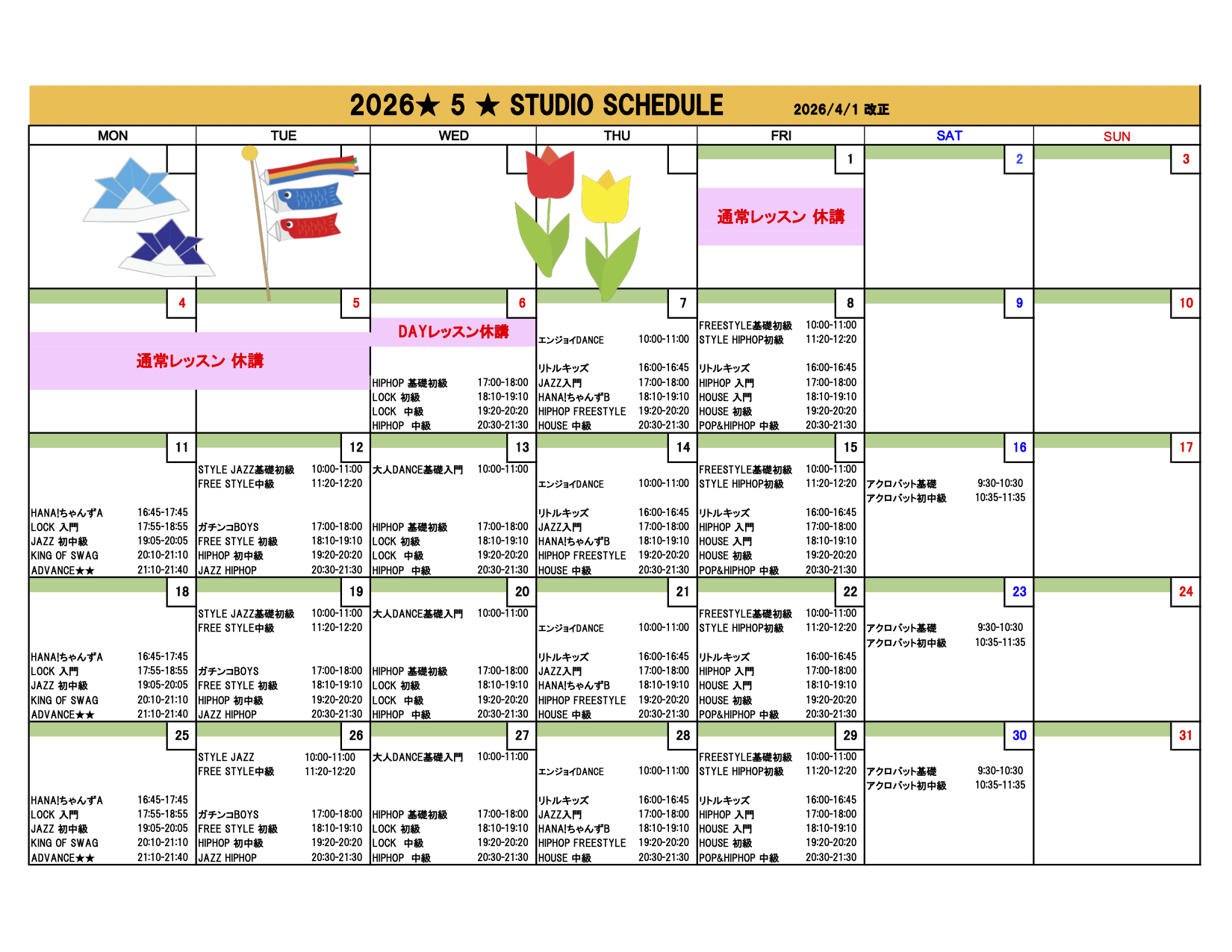 SCHEDULE WEEKLY SCHEDULE 2026年4月〜 各レッスンの内容はコチラ MONTHLY SCHEDULE 2026年4月(2026/4/3更新) 2026年5月(2026/4/3更新)